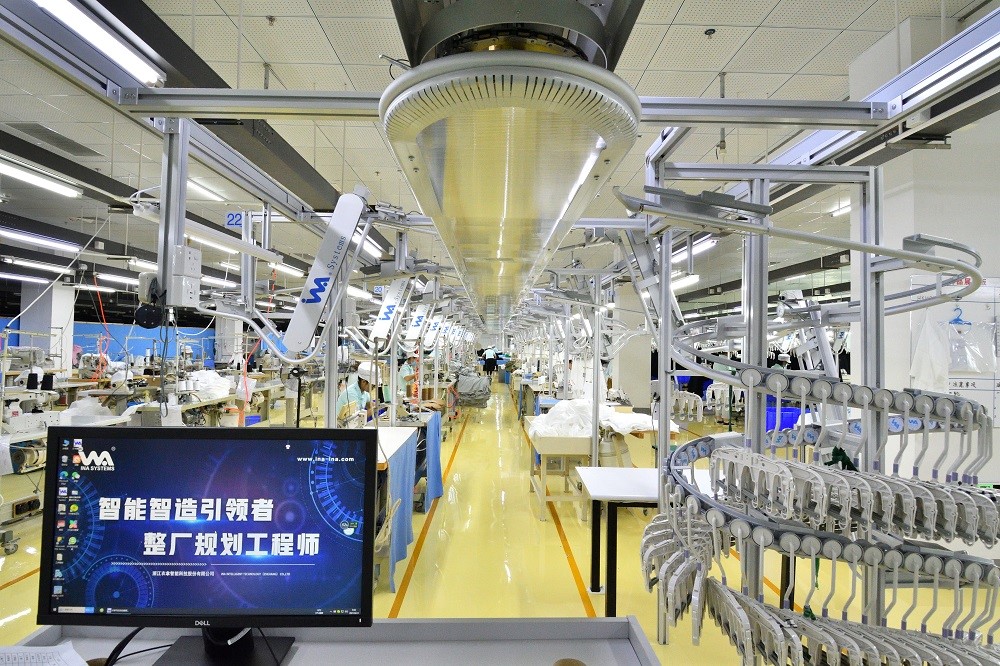 除了面料染色的智能化改造,圍繞服裝的設(shè)計(jì)、研發(fā)、生產(chǎn),元首集團(tuán)也正在加快變革,通過探索和引進(jìn)自動化縫制單元、智能吊掛系統(tǒng)、柔性整燙系統(tǒng)、自動立體倉儲和物流配送系統(tǒng),建立生產(chǎn)流程的MES系統(tǒng)管理,提高生產(chǎn)效率。