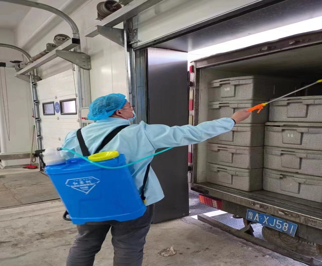 為保證食品安全和員工自身安全,金德利團餐公司、供應鏈公司每天都堅持消毒環(huán)節(jié)的打卡監(jiān)督管理。進入公司園區(qū)的車輛嚴格進行消殺,大噴霧器對進出車輛進行消殺、登記;對接車間具體負責人安排專人對食品箱進行消殺。
